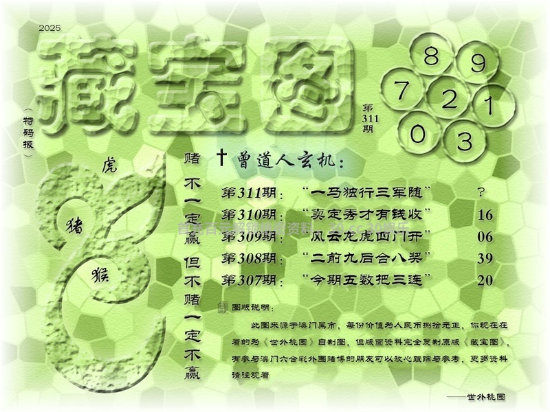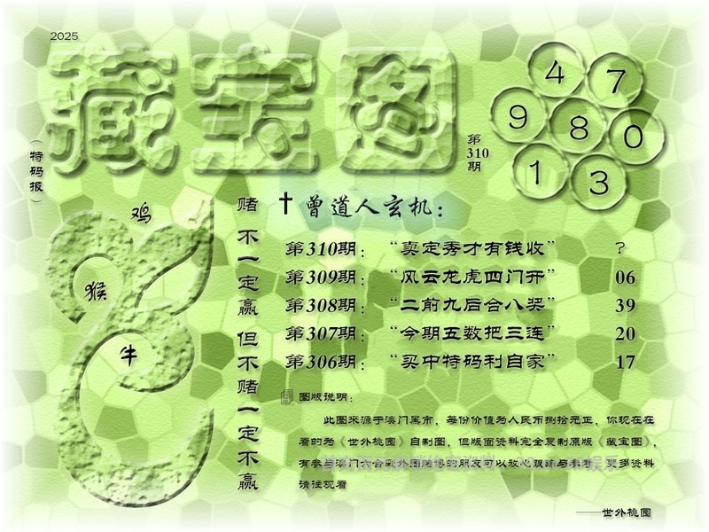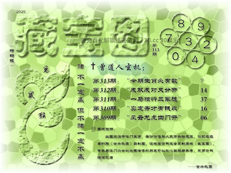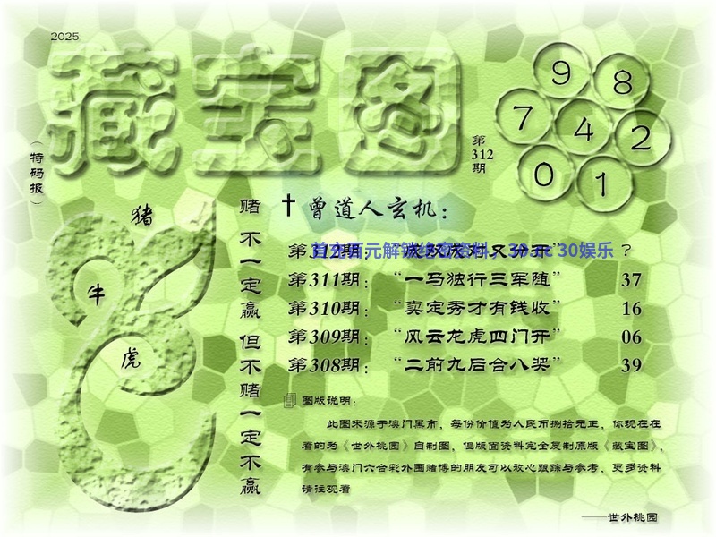 314期藏宝图曾道人玄机:更新 解:更新 解特肖:更新 |